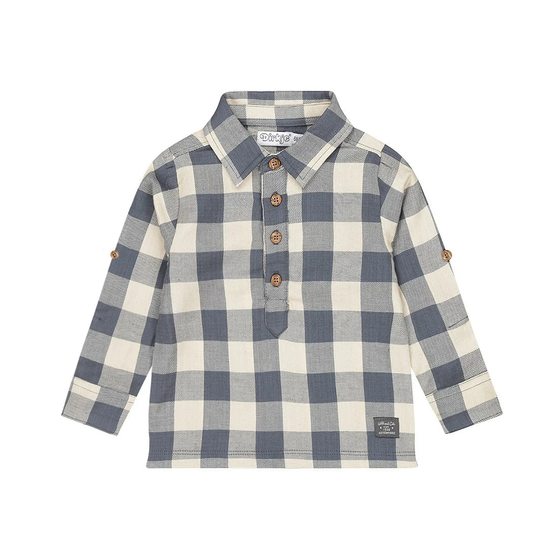 Questa camicia in panno dall'intramontabile fantasia a quadri nei toni del blu navy, è realizzata...