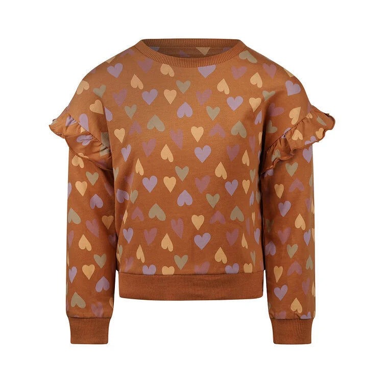 Questa felpa marrone con una stampa a cuore colorata, presenta uno scollo rotondo, spalle scese...